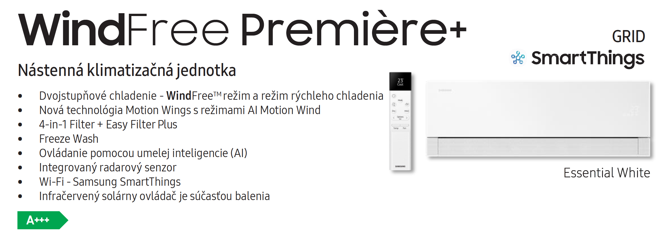 Klimatizácia Samsung WindFree™ Première+ s výkonom 3,5 kW je určená pre tých, ktorí hľadajú technologický vrchol v oblasti úpravy vzduchu. Modelová zostava (vnútorná jednotka AR70H12CAAWNEU a vonkajšia jednotka AR70H12CAAWXEU) je ideálnou voľbou pre miestnosti s rozlohou do 35 – 40 m².