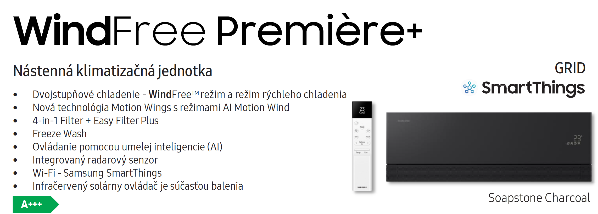 Klimatizácia Samsung WindFree™ Première+ s výkonom 3,5 kW je určená pre tých, ktorí hľadajú technologický vrchol v oblasti úpravy vzduchu. Modelová zostava (vnútorná jednotka AR70H12CAAWNEU a vonkajšia jednotka AR70H12CAAWXEU) je ideálnou voľbou pre miestnosti s rozlohou do 35 – 40 m².